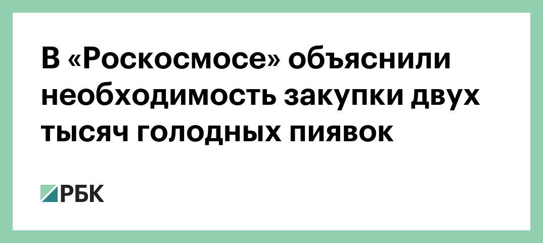 В середине апреля предприятие «Роскосмоса» разместило на портале госзакупок заявку на 1,8 тыс. медицинских пиявок, за которые готово отдать 89 тыс. руб. Аптекарских или лечебных пиявок размером от 8 до 12 см с продольной оранжевой полосой должны поставлять по 300 штук с периодичностью раз в два месяца. Пиявки должны быть при этом голодные (не менее трех месяцев голодания). Срок закупки — до мая 2020 года.