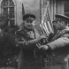 Лейтенант Уильям Робертсон и лейтенант Александр Сильвашко на фоне надписи «Восток встречается с Западом», символизирующей историческую встречу союзников на Эльбе