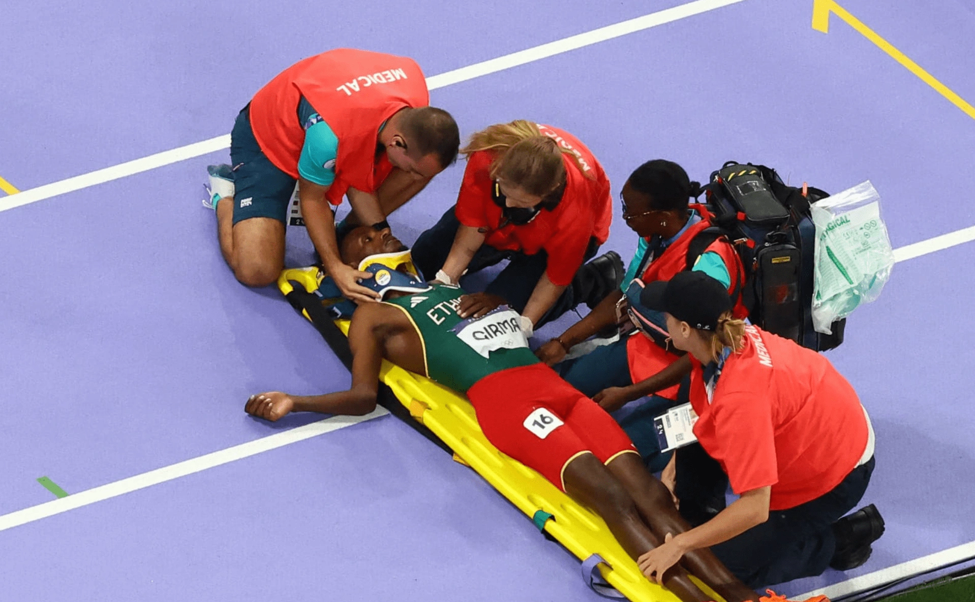 Как сообщает журналистка Джули Стюарт‑Бинкс, эфиопа унесли на носилках в подтрибунное помещение.