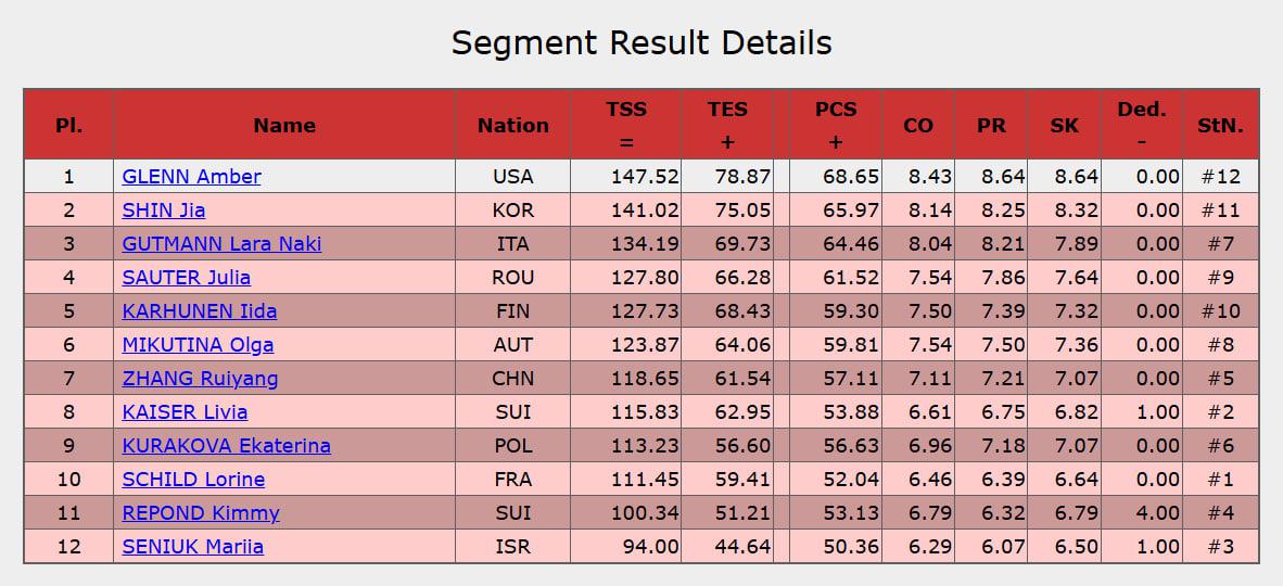 22:00. Результаты фигуристок после первой разминки.