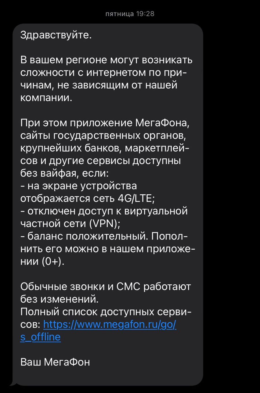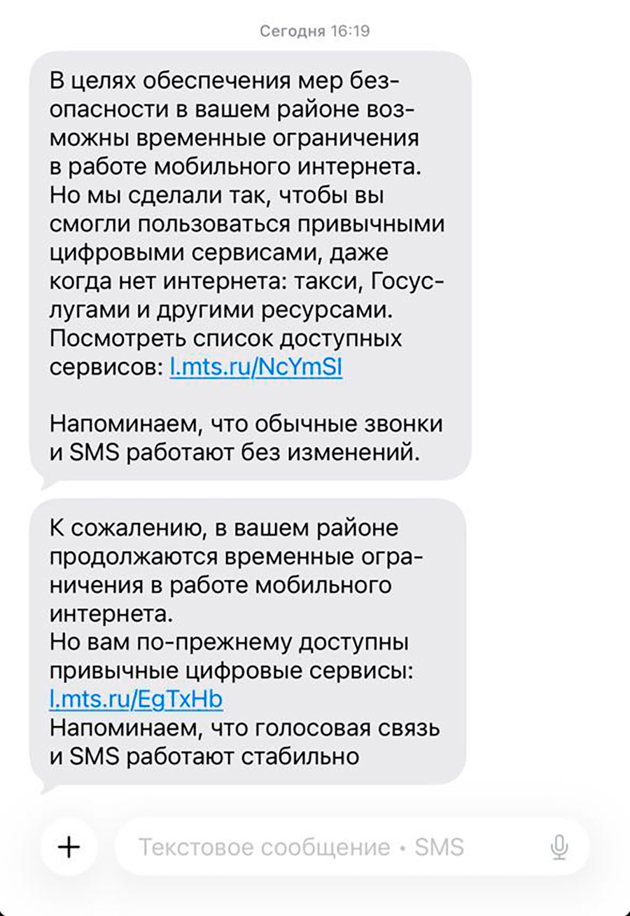 «В целях обеспечения мер безопасности в вашем районе возможны временные ограничения в работе мобильного интернета», — говорится в СМС-рассылке.